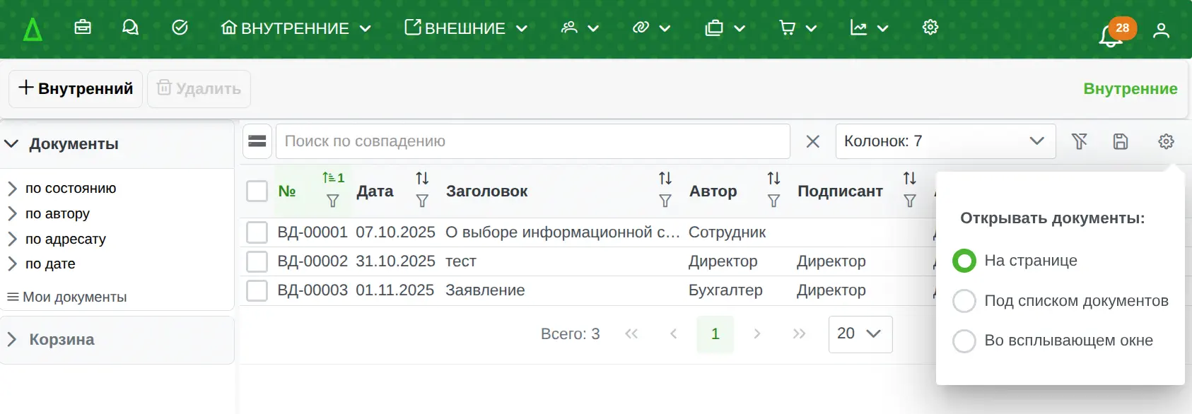 Кнопка с пиктограммой в виде шестерёнки позволяет настроить способ открытия документов из журнала: на странице (документ будет отображаться вместо журнала), под списком документов (рабочая область с таблицей журнала будет разбита на две части) или во всплывающем окне.
