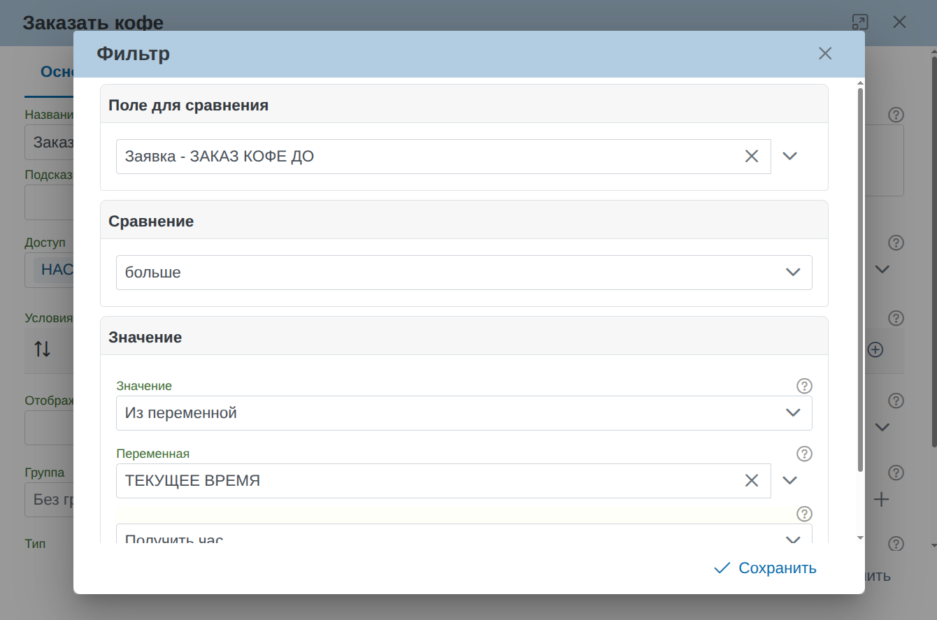 для заказа кофе можно показывать всем сотрудникам, но только до 16 часов. Мы добавили поддержку переменных в