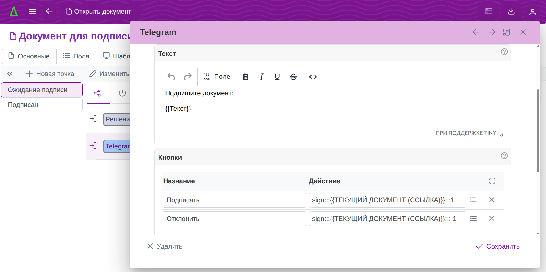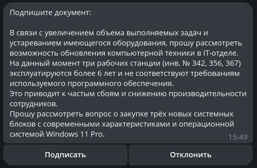 легко создавать полноценные Telegram-боты для общения с сотрудниками, например — для подписания документов,