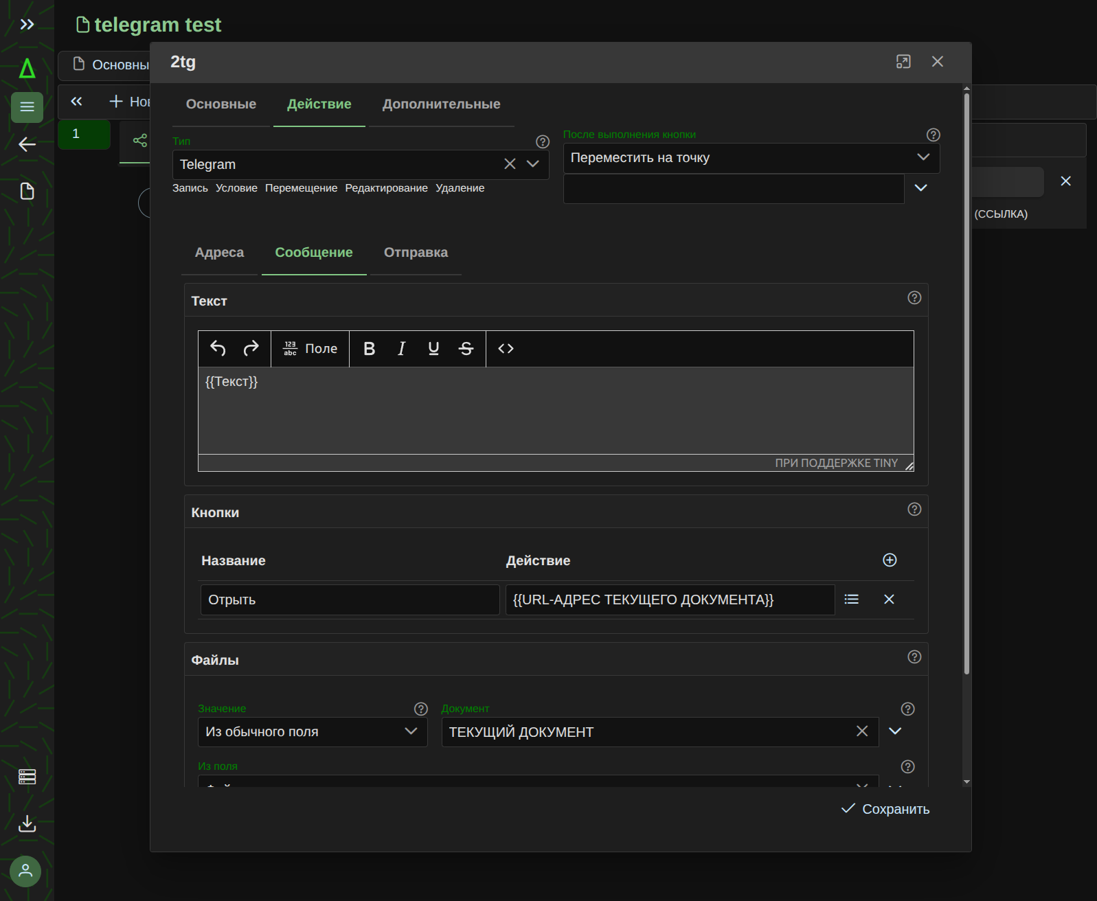 💰 Действие «Telegram» будет платным. Но в текущей нестабильной ветке, начиная с версии 6.7.55, его можно